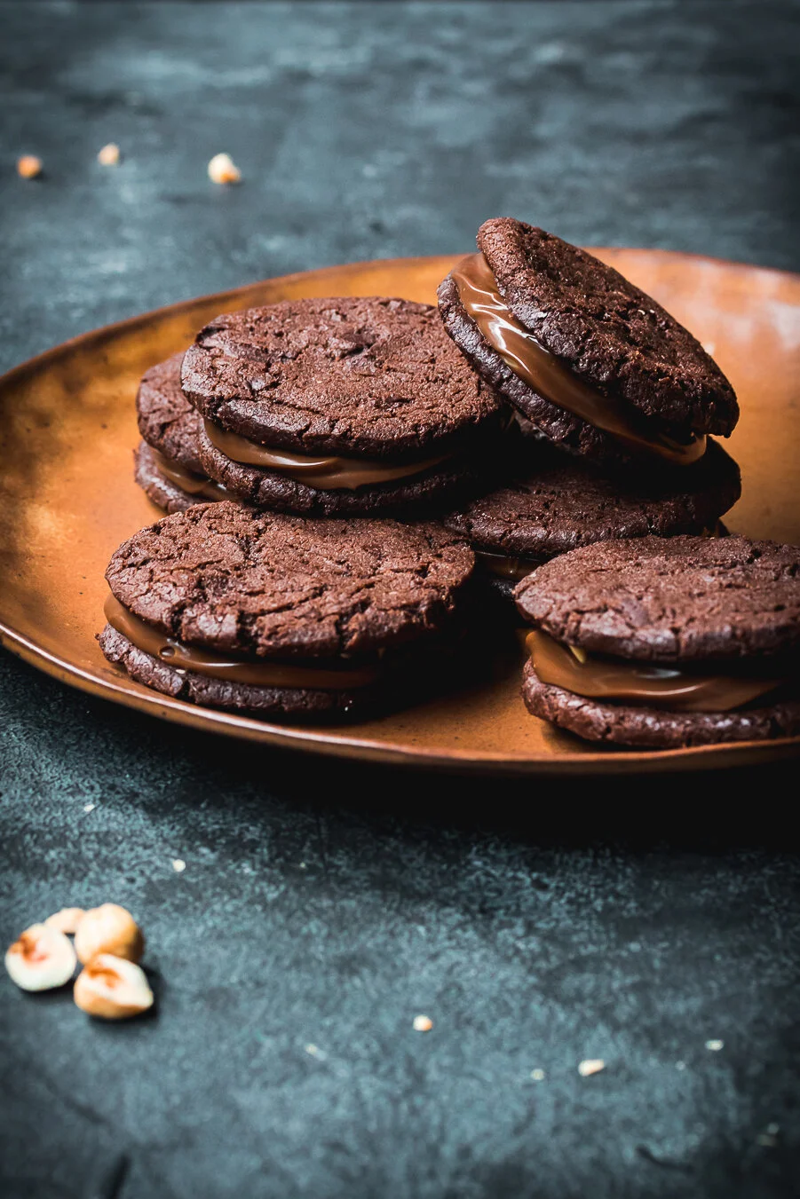- Pipe the ganache onto the base cookie, add the chopped hazelnuts if using and use the top cookie to sandwich.